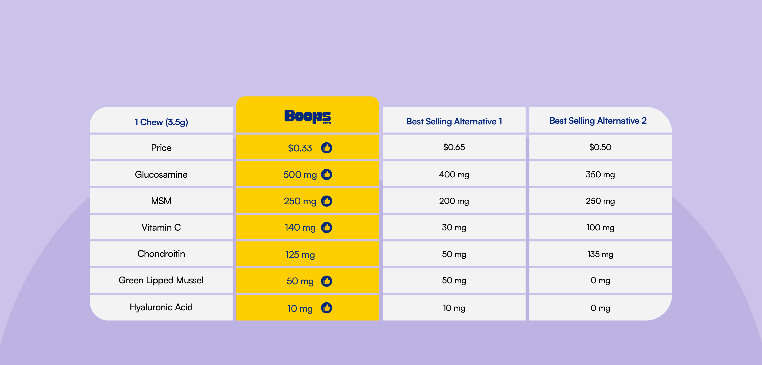 Our chews deliver ample amounts of key active ingredients, including Glucosamine, MSM, Chondroitin at levels far above typical joint supplements. Because we don't skimp on the good stuff, we deliver real results. We use a whole food ingredients like pumpkin, green lipped mussel, and chicken with ample active ingredients for better mobility, comfort, and tail-wagging energy.